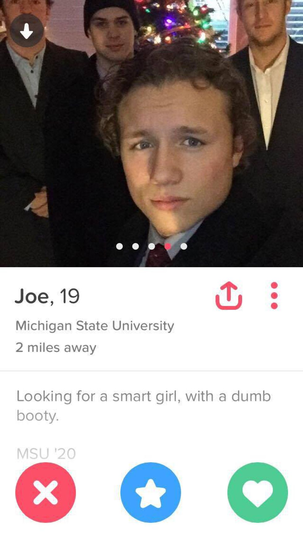 The guy who uses Tinder solely for hookups, which is why it exists in the first place, right? Joe, I don't know who you are, but no "smart girl" is going to give you her dumb booty.