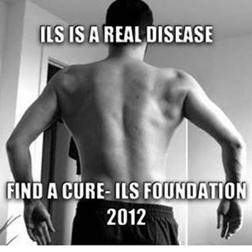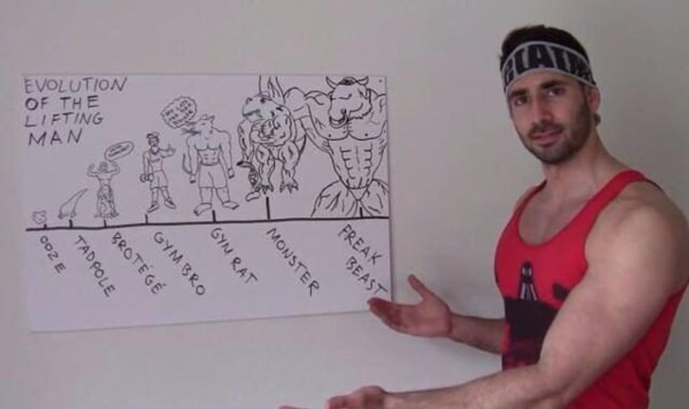 Referring to Dom Mazetti's "Evolution of the Lifting Man," pictured above, the Freak Beast is the final stage of gymbro evolution. This is the burliest, strongest, manliest guy at the gym, and everyone knows it. Everyone else at the gym gives the Freak Beast a wide berth, because unlike the Bicep Bros who came down with a severe case of ILS (Invisible Lat Syndrome, pictured below) the Freak Beast is actually wider than he is tall.