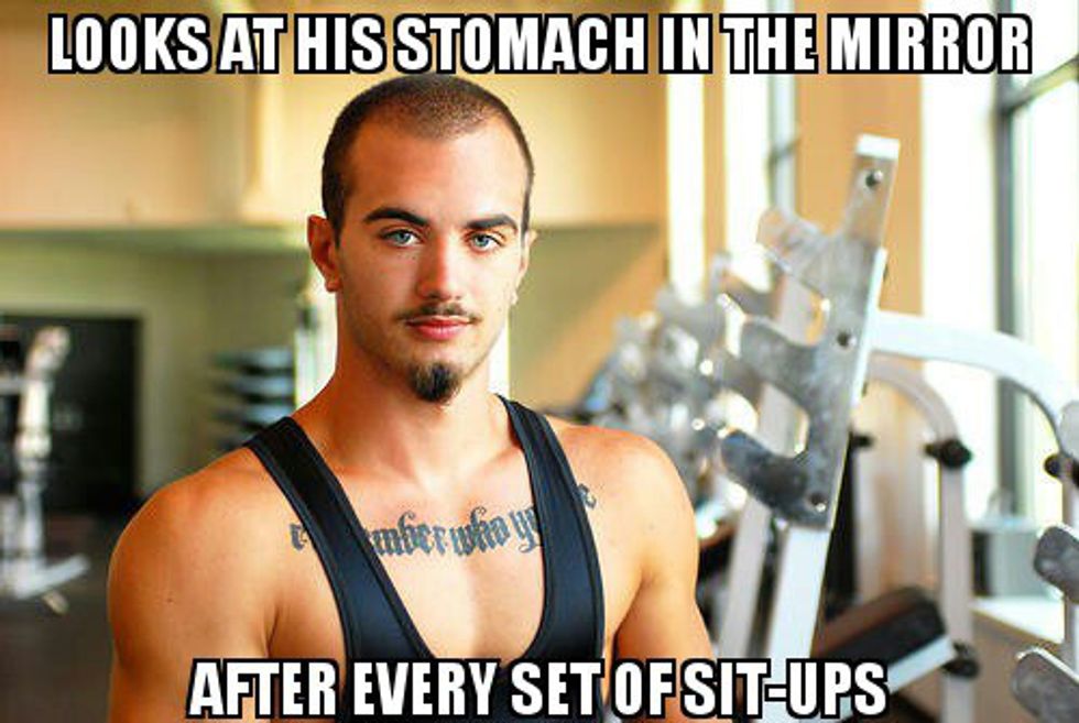 This guy wears a cutoff with his nipples showing, usually plants himself smack in front of a mirror (for a better view of his muscles, duh) and just had his fifth protein shake of the day.