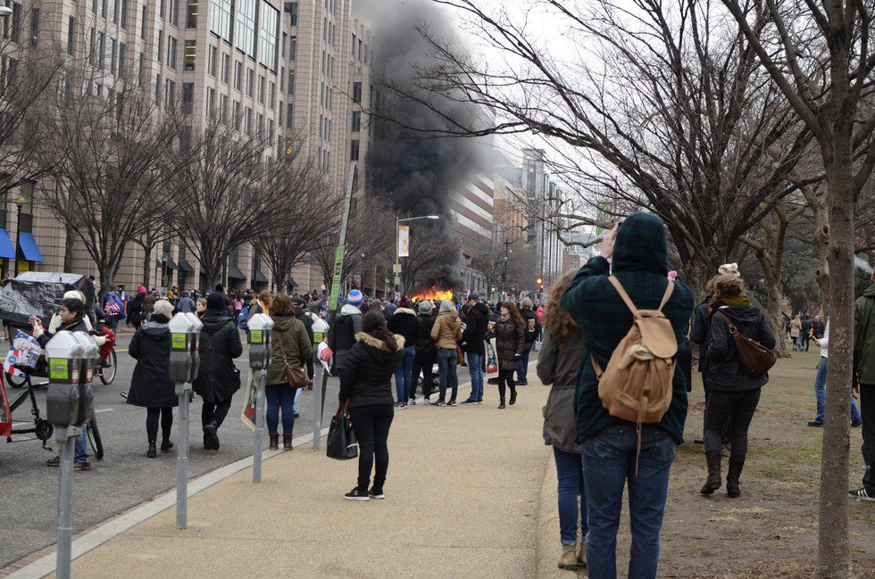 We had found our way to Franklin Square, where soon after our first encounter with Vermin Supreme, we heard yelling. Turning to see what the commotion was, we saw the smoke. As lines of people were taking selfies with Vermin, Trash cans had been pulled off sidewalks into the streets and lit on fire. The anarchists wore masks covering their faces. After minor success lighting one can, and only smoke from a second, the anarchists turned their sights on a parked limo. Someone to our right rolled a random tire up the street toward the gathering crowd. I had no idea where they had gotten it, but my guess was they either intended to stand on it or burn it. A plume of black smoke began to rise from the other side of the crowd as the flames rose.