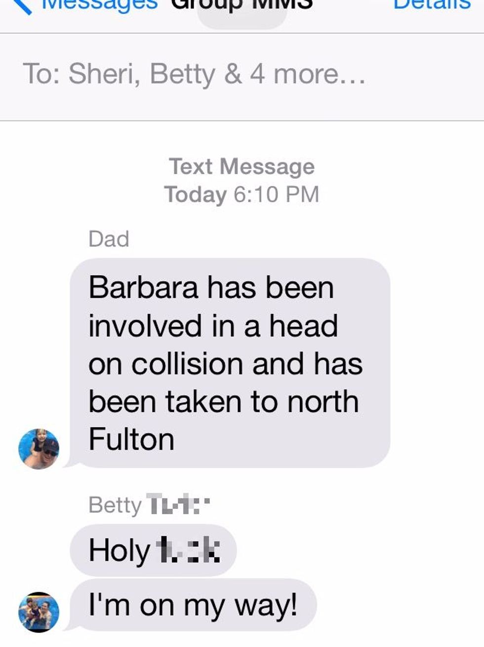 The anxiety of not knowing if my mom was alive or not was terrible, but it doesn't compare to the harsh reality. We are incredibly lucky my mother survived such an awful accident, but the idea of seeing my mom in constant pain is going to be unbearable. And once again, this all stems from someone choosing to not pay attention. We've all diverted our attention away from the road , thinking nothing bad could happen to us but we have to think about other people too. My mom was obeying all the traffic rules and only got hurt because someone else decided not to. It may be your choice to ignore the rules of the road, but you can hurt more than just yourself when doing so. Please be responsible when driving.