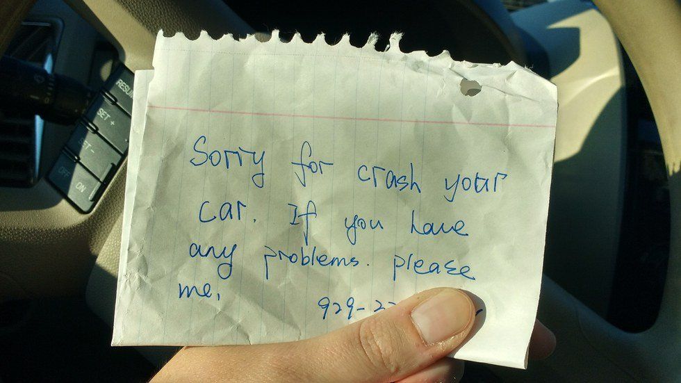 It wasn’t anything serious. I noticed a note stuck in my wipers as I was about to leave campus for the day, and after reading the note and circling my car a few times I STILL have no idea where my car was hit.