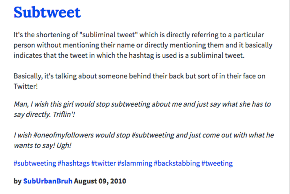 Subtweeting is a way to write about someone without directly mentioning them in only 140 characters. According to Google Trends, subtweeting picked up in 2010 – the same year that it was entered into Urban Dictionary. In 2012, people have been searching “define subtweet” and to this day, this search is still popular. So the mystery of subtweets is still being discovered today.
