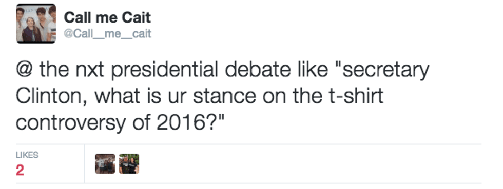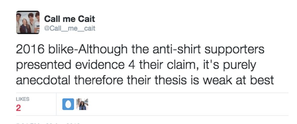 While I found these rules outrageous, they were gospel and despite every inclination not to, I bought into the system. With so much uncertainty in the college process, many seniors found comfort in these guidelines. We may not have known where we were going next year, but at least we knew how to conduct ourselves with some dignity. That is, until our beloved principal made an announcement at the class meeting, that challenged our sacred covenant and threw the class of 2016 into a tailspin. He informed us that people were upset by the tradition of wearing college T-shirts on the last day, and we should think twice before choosing to wear them. Left to our own devices and without any clear direction on where we should go from here, the grade went into a full-blown panic attack. Our system was being tested and there was no clear and diplomatic response. While everyone around me was already having heated intellectual discussions about the benefits and drawbacks of the college T-shirt, I left the class meeting baffled, observing the hardwood linoleum that had transformed into a battlefield before my very eyes. A friend in the trenches approached me and remarked on how grateful she was that the principal brought up this matter, I agreed. “I know right, so important,” I responded, hoping I was on the right side of history (still not fully comprehending the complexity of the discussion or why anyone would care so much about a T-shirt). A few minutes later, another friend approached me, expressing her outrage at the principal's remarks, “I’m proud of where