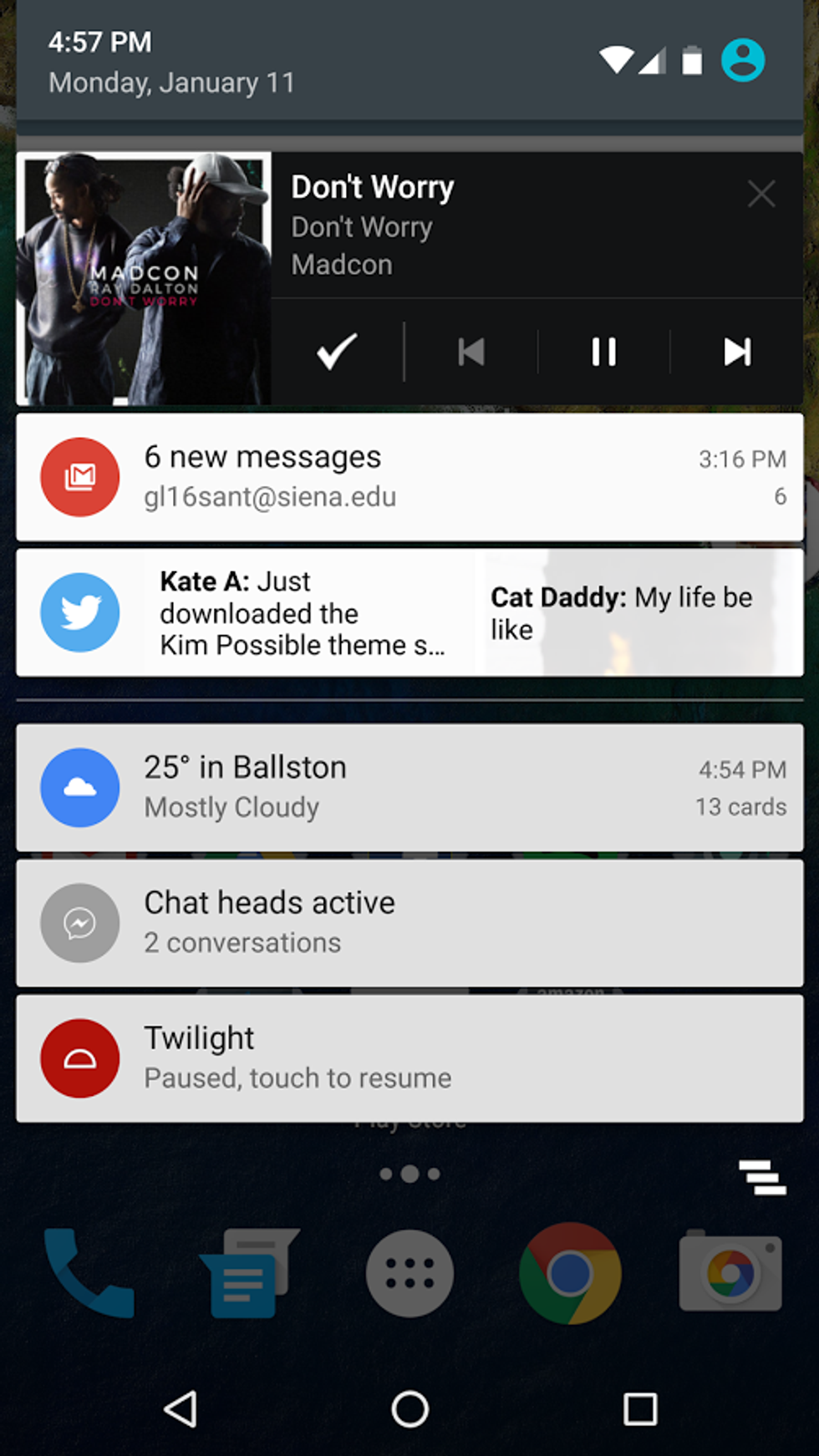 Plus, notifications are just more colorful on an Android, usually coming with pictures. Spotify and Play Music look great when you’re playing music on your phone and the Nexus easily separates the apps that always have something running on your status bar (like chat heads for Facebook Messenger) from new notifications.