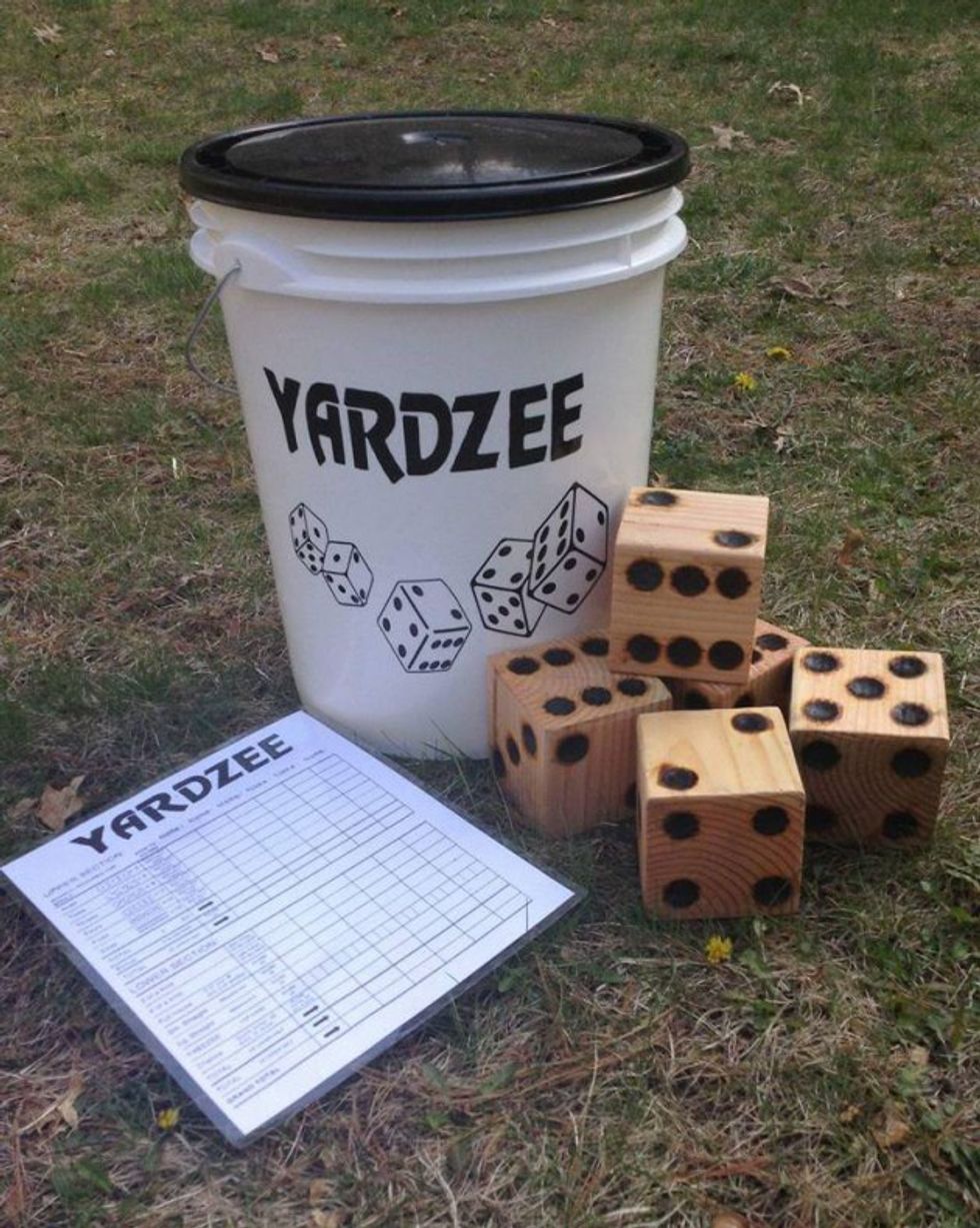 I came home from college for the summer to find that my dad had made about eight sets of a large lawn version of Yahtzee, rightfully named "yard-zee". This game involves making the 4x4 wooden cubes yourself or buying them, then painting the dots on. You'll also need a bucket and score cards, which can easily be enlarged and printed from online.