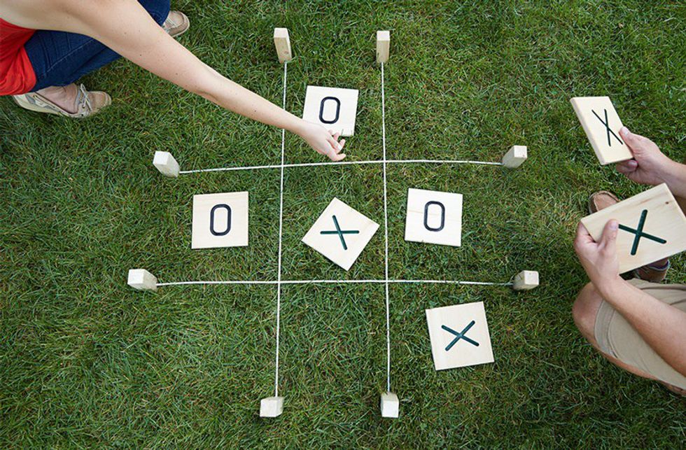 We've all played tic-tac-toe on the back of our placemats at a restaurant while waiting for our food, or in the back of our notebooks at school, but now you can play a larger version in your backyard. This is a simple game to construct. All you need is eight pegs and four pieces of string connecting two of the pegs together. Place two of them parallel in the ground, then cross the other two over them, creating nine squares. Then put X's and O's on cubes of wood, or rocks.