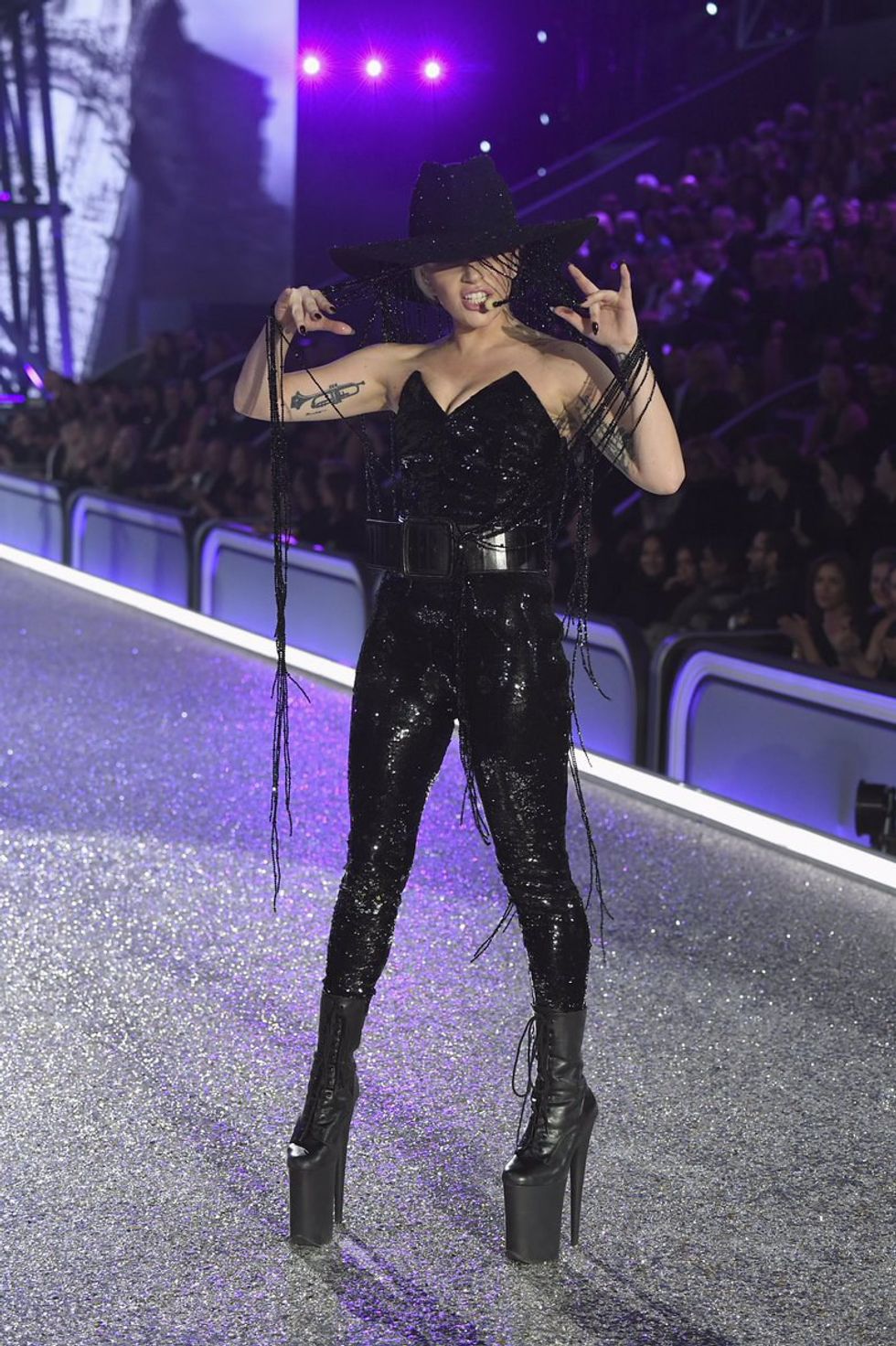 Lady Gaga in Saint Laurent and a $1 million dollar, 45,700 Swarovski crystal covered hat.
