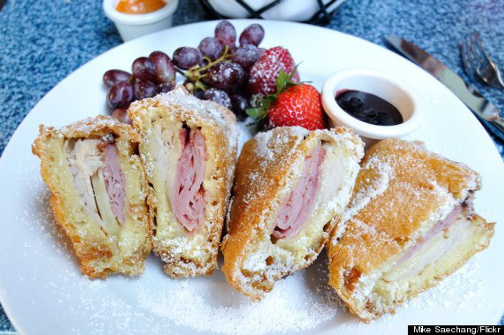 This sandwich right here is no joke... turkey, ham, swiss cheese, deep fried, powdered sugar and a berry puree. Yeah, kiss your diet goodbye.