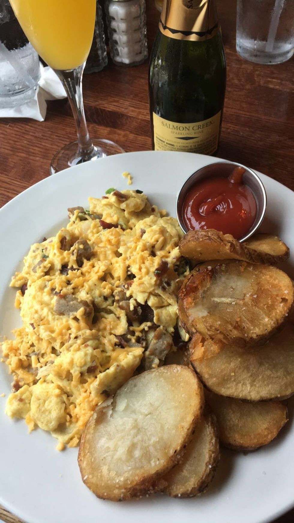 If that wasn't enough, they also came with Surly Helles Lager beer chasers on the side. HOLY SMOKES. 🔥 Not only were these drinks massive but they were hella strong too! The best part was, you got all of that for only seven bucks!! SCORE. I am not a Bloody Mary fan --you can probably guess why if you've been following me for awhile LOL-- so I went with a nice mango Mimosa instead.