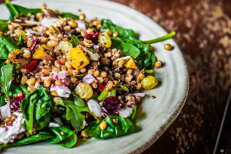 So many diets today avoid carbs, but a low-carb diet can become dangerous and affect key bodily functions. Good carbs provide glucose for the brain, help reduce bloating, help produce serotonin, provide energy, contain B vitamins, and help prevent heart disease. Great fruit and vegetable sources include: melon, craisins and raisins, pineapple, diced apple, sliced pear, berries, figs, green beans, mandarin oranges, peaches, mushrooms, edamame, peppers, cucumbers, beets, squash, broccoli, carrots, and asparagus. Other choices include: sweet potato, tortilla strips, whole wheat croutons, couscous, farro, quinoa, barley, brown rice, plantain chips, pepitas, cooked pasta, and chickpeas.