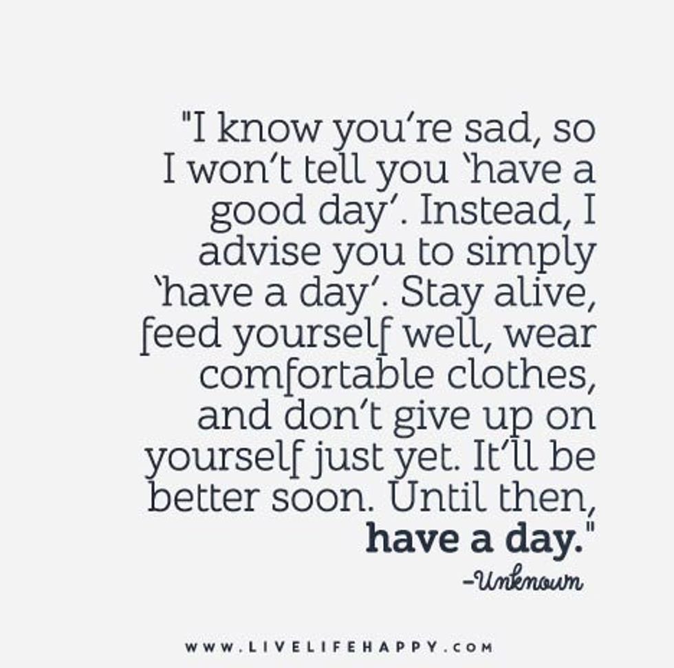 So, today I challenge you to stop this cycle in one of the simplest ways. It may sound trivial to change such a mindless habit, but it can make a difference. Make an effort to tell others to have a day. Tell yourself to have a day. Let go of your expectations and the pressure you place on yourself. Just see what the day brings. You might be surprised at how your day turns out after all.