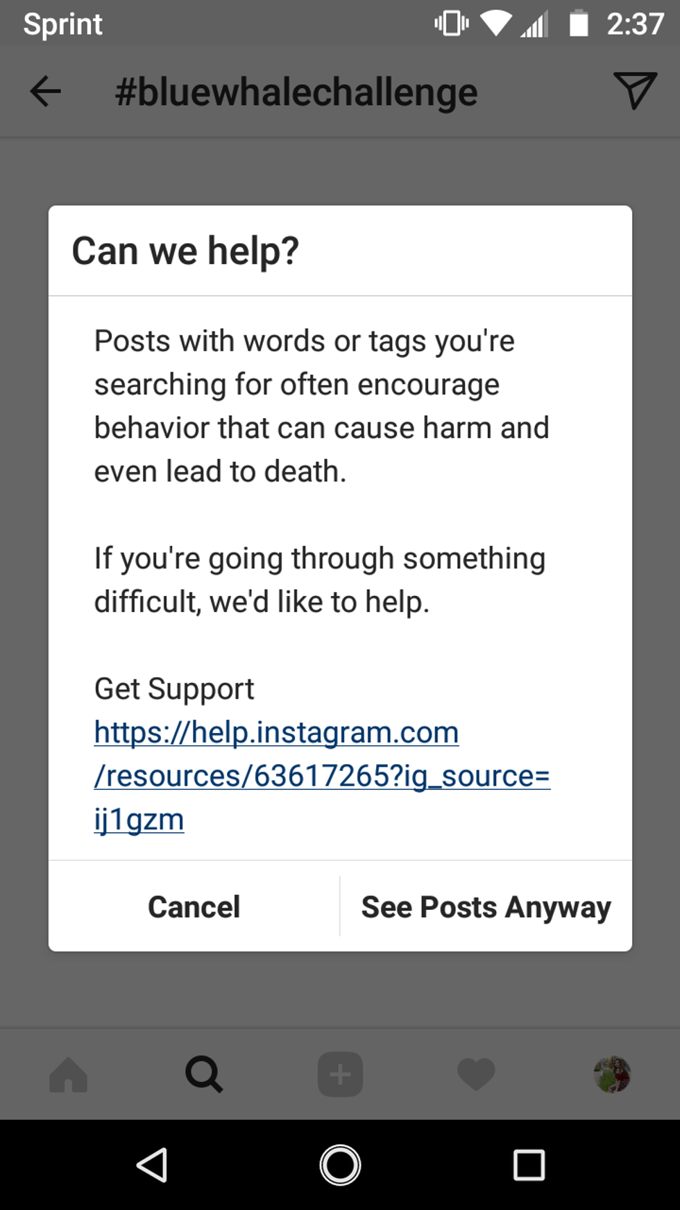 These disturbing messages are only the beginning of this tragic game. Pictures show people posting evidence of them fulfilling the challenges, begging for entry into the game.Fortunately, social media platform Instagram has stepped up, offering support for its users experiencing depression and suicidal thoughts. The following message popped up after I searched "#bluewhalechallenge".