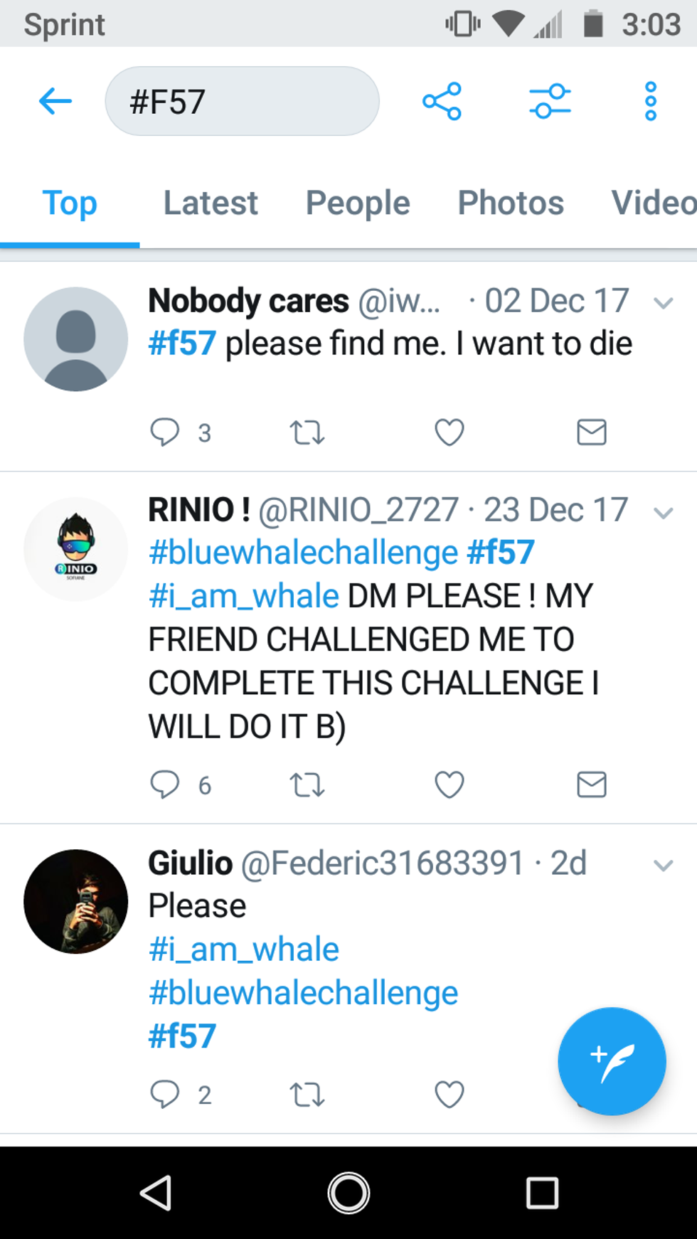 Hashtags such as "#F57", "#bluewhalechallenge", "#i_am_whale", and "#curatorfindme" reveal those begging to play the game, hoping to catch the eye of a curator.