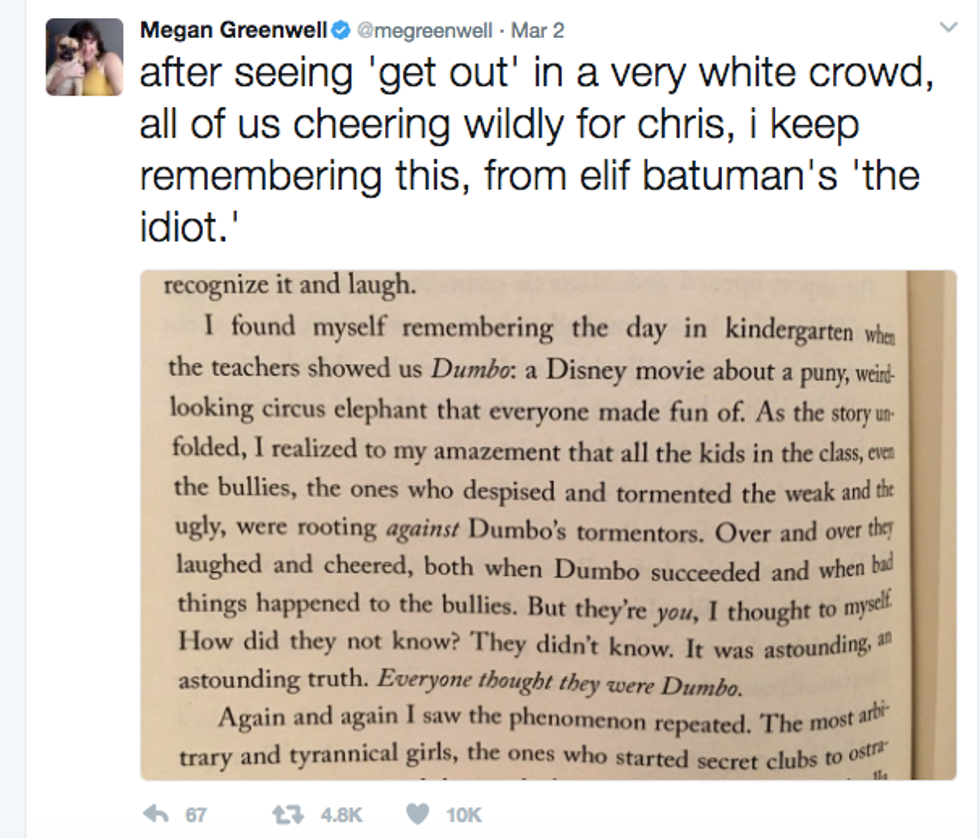 Here, Greenwell likens the "Get Out" experience to Elif Batuman's novel The Idiot in a scene in which school bullies watch the movie "Dumbo" and find themselves identifying and rooting for Dumbo even though they perpetuate the same harm to the bullied main character that Dumbo's tormentors perpetuate against Dumbo himself. This draws a parallel to the way in which non-black moviegoers like to think that they can identify with the oppressed protagonist, and they like to think they're different from the racists depicted in it, when really they are also guilty of maintaining harmful social norms and preconceptions that add to the oppression that the protagonist faces.