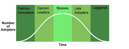 Once sales make it past the point of a fad, fashion will start to develop among the population. The trend will originate with fashion innovators, then are spread by opinion leaders, eventually, the trends catch on and are adopted by the masses. After the peak of popularity for the fashion trend, late adopters will pick it up as the trend drops off. Just before it falls out of favor, laggards will catch on and appreciate its last few moments of glory.