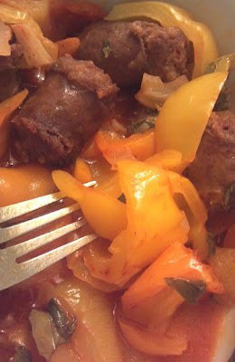 This recipe IS FREAKING AMAZING. I'm a huge fan of really good sausage, peppers and onions. This recipe makes it with Italian sausage, but I like to use chicken sausage because it's healthier and it usually comes pre-cooked, so all you have to do is heat it up! It also calls for a casserole dish, but you can use a microwavable bowl as well.
