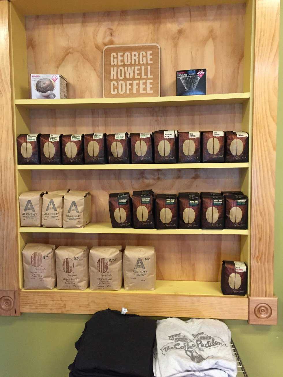 The Coffee Pedaler brews George Howell-roasted beans. George Howell is a pioneer in the coffee industry. In the early 1970s he sold his chain of specialty coffee shops in Boston to Starbucks, which would capitulate Starbucks' Northeast expansion. Nowadays, Howell is roasting speciality coffee, mostly single origins, to sell for wholesale.
