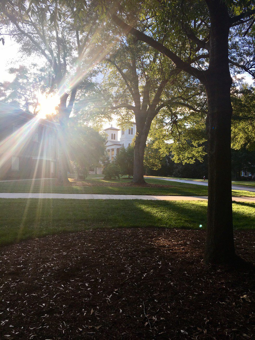 Last Saturday I was walking back to the dorms after the football game with a friend—we were tired from the sun and long day, so mostly we enjoyed the silence. As we neared the dorm I turned around to ask my friend a question, but I caught a glimpse of the light leaking through the leaves of the large oaks; the beauty overtook me such that I paused in the middle of the sidewalk and let myself relish in the moment. I pointed out to my friend how the leaves glowed with that indescribable, warm light. I explained to him that I absolutely adored how the sunset itself can be impressive, but I often find myself more enamored with how the consequential shadows and warm glows make the day feel resolute and content. We spent the remainder of our walk talking about appreciating other small moments: two a.m. runs to Waffle House, phone calls with your mom, study dates with all your friends in one small room.