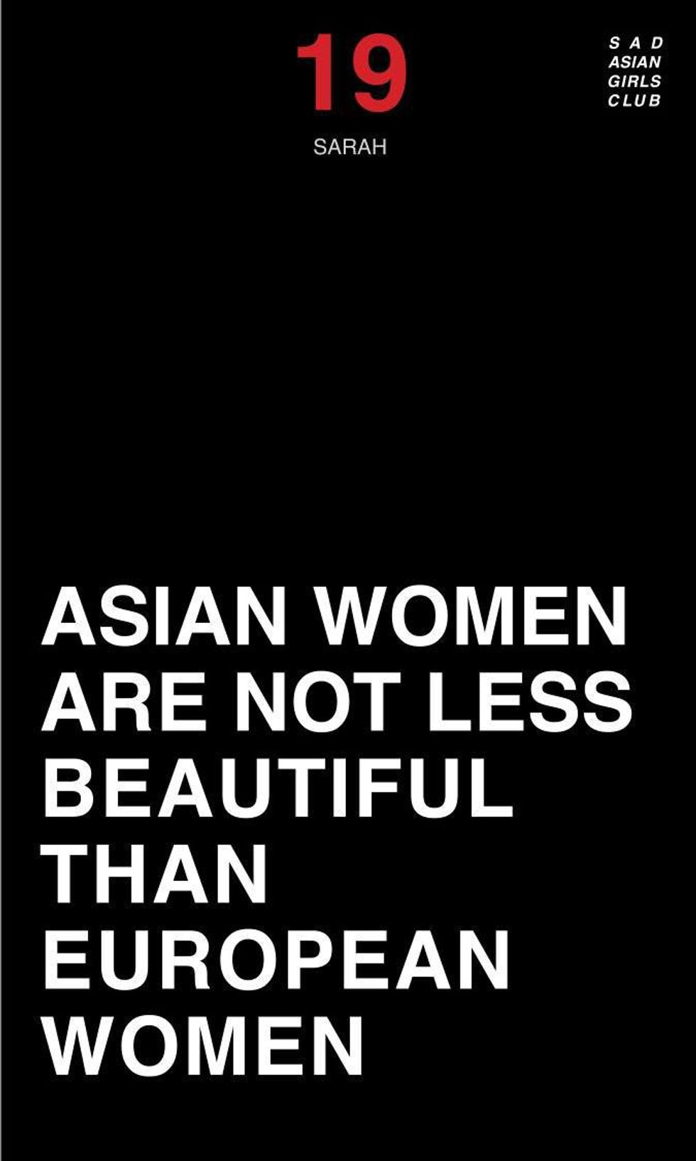 to encourage women of color to embrace their dark skin and as a counter to the skin lightening product called "Fair and Lovely." The recently formed feminist art collective, Sad Asian Girls Club, attacks Asian stereotypes as being silent and passive while also challenging society’s ideas of Asian beauty.We live in the era of a globalized economy, so why not globalize our standards of beauty too?