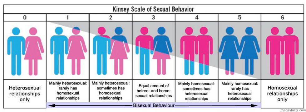 The main way this concept is visualized is the Kinsey Scale of Sexual Behavior. This scale defines human sexuality in a set of numbers from 1 to 6, from heterosexual only to homosexual only. The Kinsey Scale originates from both the Male and Female volumes of The Kinsey Report. These findings were made as part of an effort to describe people's sexuality and sexual experiences at any given time. This scale, although most know it as being from 1-6, also includes an "X" rating, for those who experience little to no sexual attraction. People who identify as heterosexual only, and even those who identify as wholly homosexual, assume that anyone who is attracted to more than one gender simply falls in the middle, at a three. There are so many more places to identify on this scale, however. One can be 60/20 in favor of a gender that isn't their own, or the same proportions leaning more towards homosexuality. The erasure of these numbers and identities is a huge problem in both the straight and gay communities.