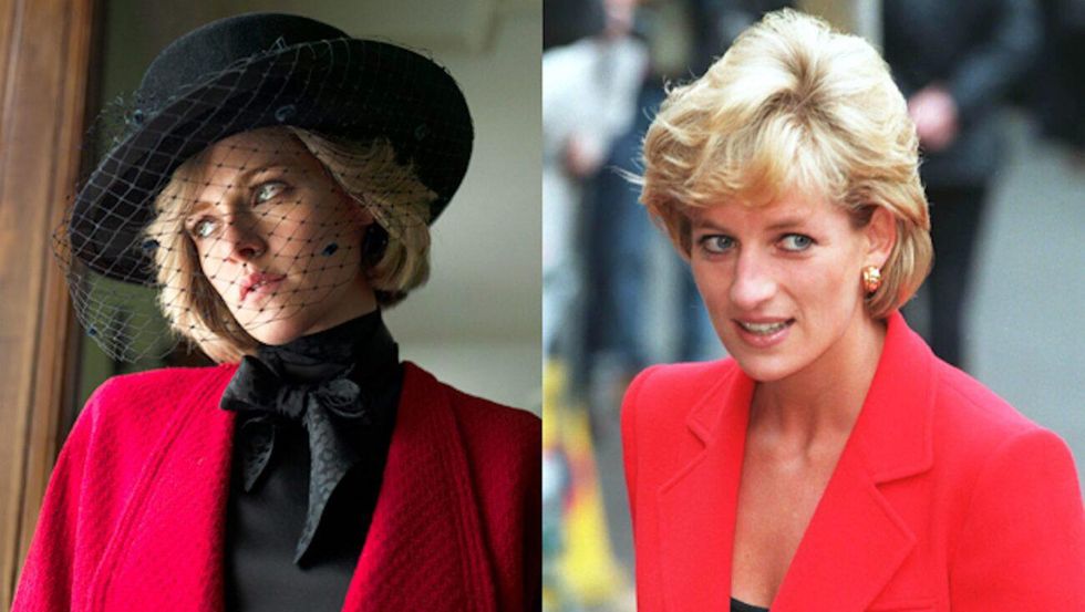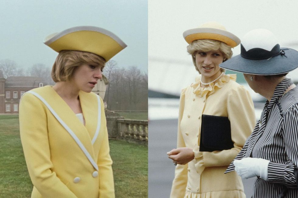The film's costume designer, Jacqueline Durran, paired the shirt with a black veiled hat to resemble the outfit Princess Diana wore for Christmas in 1993.