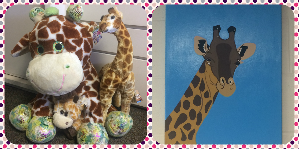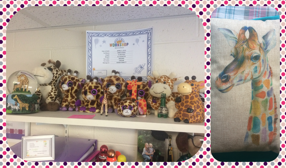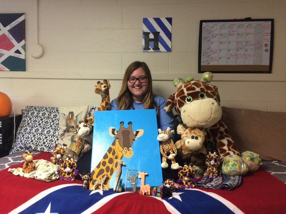 With all this knowledge comes so much love for these beautiful creatures. If it isn't already known from my cover photo, I collect giraffes. I started collecting giraffes my freshmen year of college, so about a year ago. Right now I own roughly 23 giraffes in various forms; plush, phone cases, paintings, pillow cases, phone stands. keychains. scarfs, shawls, wall decals, pens; almost anything you can think of. I have gotten most of my collection as gifts from friends and family as birthday, Christmas, and valentines day presents. I sometimes impulse buy them for myself as well, thats how I started my collection. Below are some up-close photos of my collection!