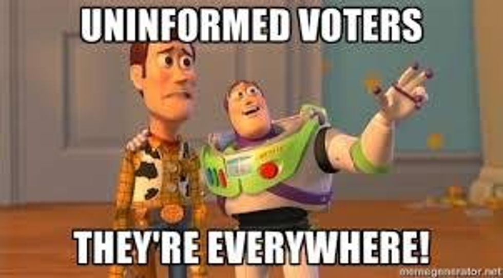"Supporters" of both Republican and Democratic candidates are so blissfully uninformed that trying to have even the simplest conversation with someone about the 2016 election turns into a game of either "I want Donald Trump because I'm sick of liberals being racist and using welfare to their advantage" or "Bernie Sanders should be president because I want to go to college for free." There are so many different aspects to each party, and each candidate within their respective party, that simply clumping them all together doesn't make sense, but the average American is so uninformed that they do just that. This leads to polarization and voting strictly based on political affiliation, which in the end causes much of gridlock that hampers the Democratic process.