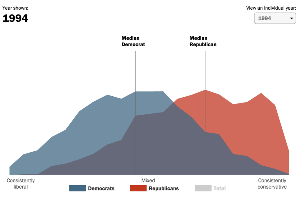 Above shows how in 1994, the 'median' Democrat/Republican were relatively close in ideals, whereas below shows how just 20 years later, that has shifted dramatically.