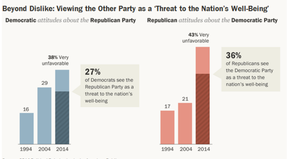 The graphs, both above and below, show how over the past 20 years, an increasing amount of Democrats and Republicans dislike the other party.