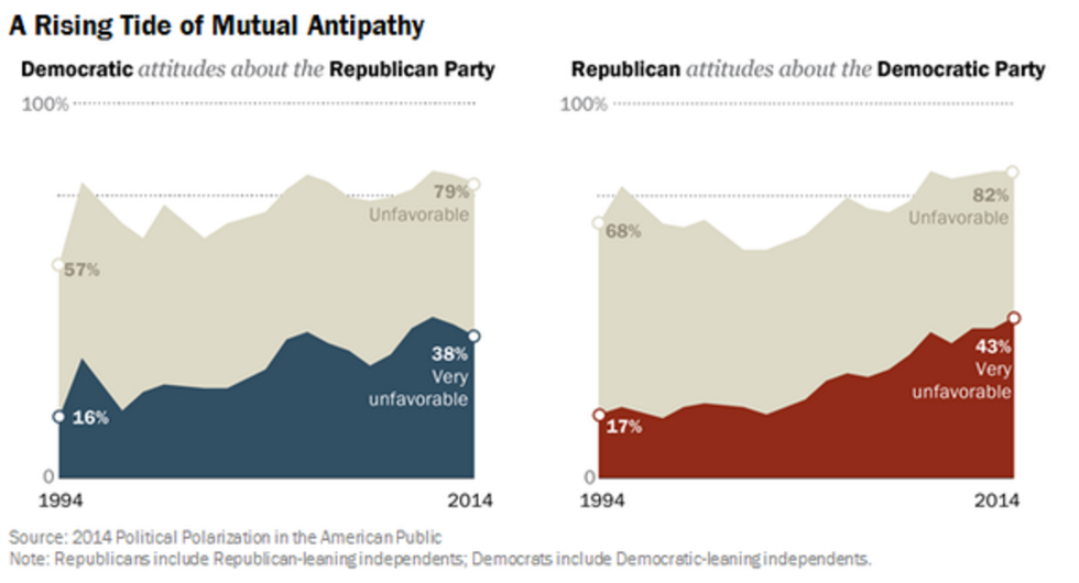 The implications that follow the two party system that the United States has in place today, are exactly what Washington feared; a divided nation. More so with the 2016 Presidential Election, the nation is not “one nation” as the Pledge of Allegiance so proudly states, but is in fact, two nations; one filled with Democrats and one filled with Republicans. Data shows that since 1994, the United States has become increasingly polarized in regards to its politics. As the graphs below shows, it also increases hostility towards members of the opposite political party.