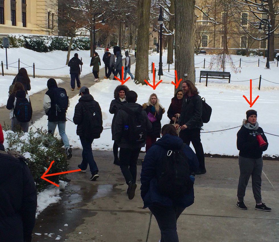 These students developed the simplest solution to the Willard Preacher's concern of feminists encouraging promiscuity and increasing the spread of diseases. Standing directly across from each other, here's what the polite showdown looked like from the perspective of a Penn State student exiting class today.