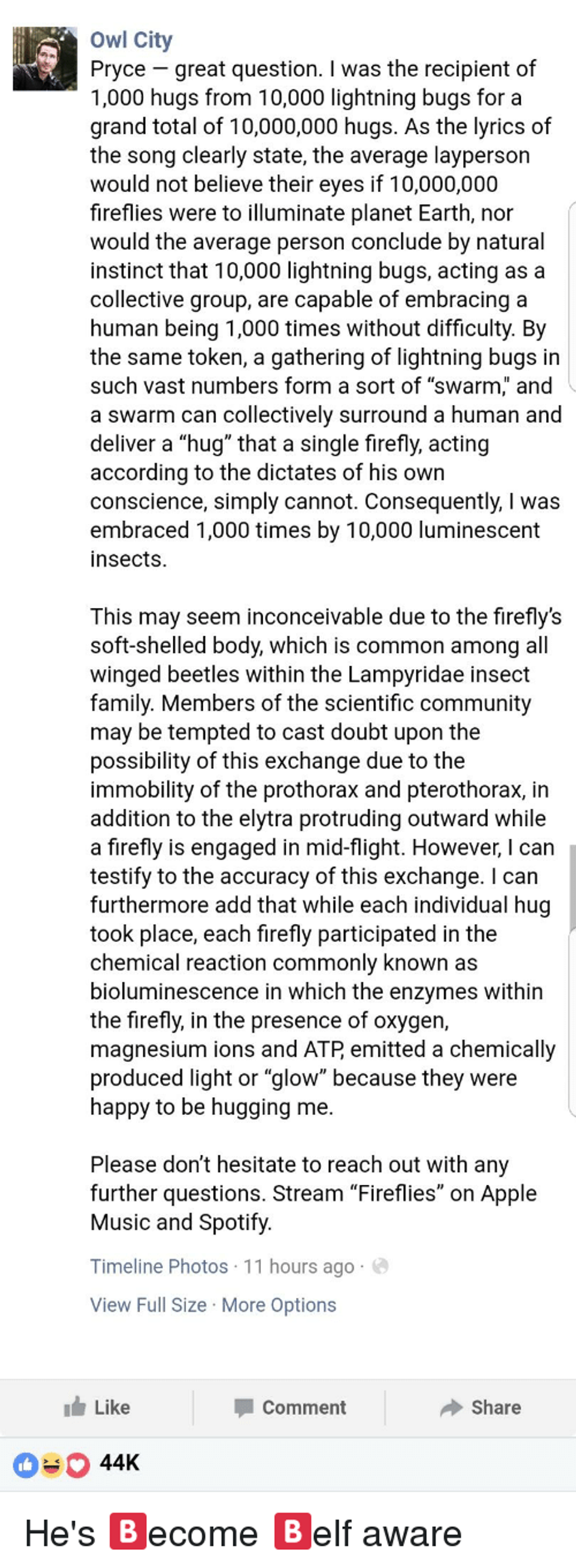 In the case of the "Fireflies" fiasco, a rare event has taken place. The constant questioning has finally garnered a response from the man himself, Adam Young, who has finally decided to put to rest the controversy he sparked all those years ago. Hats off to you, Owl City - your song has survived the gauntlet of pop radio, become a viral meme, and inspired real conversation about the way people interact.
