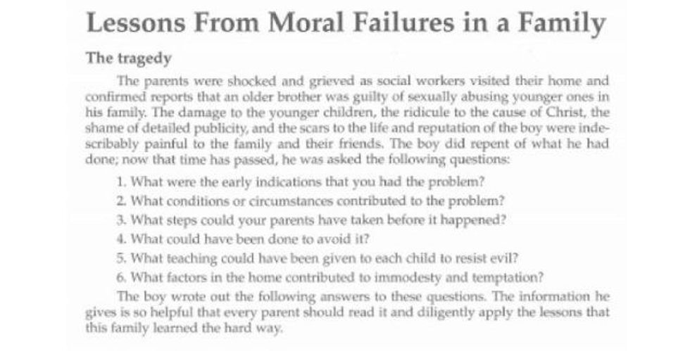 Although Gothard was forced to step down, the Duggars still follow the teaching guidelines from ATI. There is even a particular scenario in their “guidebook” that addresses the issue of an older sibling sexually abusing a younger sibling. One of the questions they instruct families to ask the older child is, “What factors in the home contributed to immodesty and temptation?”