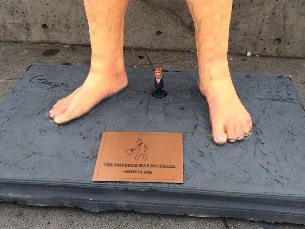 I'm trying to keep my insults politically correct towards Trump, but honestly he's just an asshole. Not once in his campaign has he tried to spread kindness, equality, or viable solutions to any problem this nation is facing. It breaks my heart to know that I could one day possibly raise my children in a nation that has allowed someone like Trump to be its leader. However, there is hope. Many Americans share my disgust in Trump's popularity. Statues are being... um erected (every pun intended)... in cities across America reminding us, "The emperor has no balls", obviously because he's so childlike. But, honestly even a child can understand that what Trump has to say is not what this nation needs to hear.
