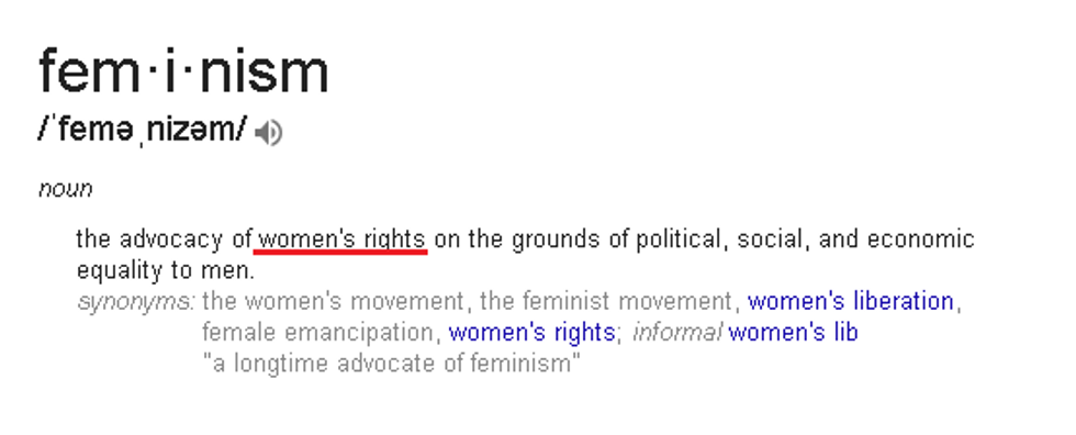 Many college students I get into arguments with insist that feminism is simply the belief in gender equality. This is only half true. The very word has a clear focus on women’s equality and women’s rights to that of men. Look up any dictionary definition, and you will see that feminism has little to no focus on men’s issues: