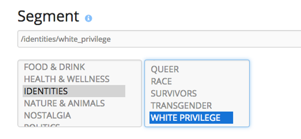 Likewise, under the segment, "Identities," there is a comprehensive list, including gay, lesbian, LGBT, Transgender and Queer. If I'm not mistaken, those could all be under the same category: LGBTQ+. Five subsegments are devoted to the LGBT+ community, yet there's only three racial categories: African-American, Asian-American, and White Privilege: