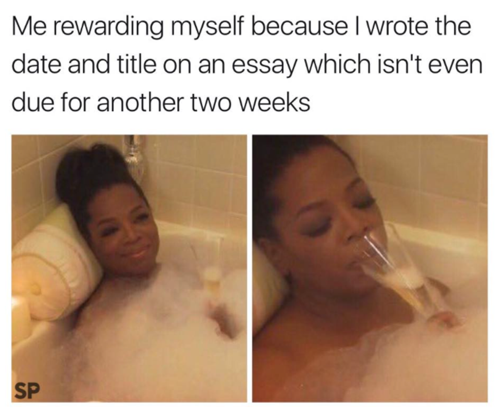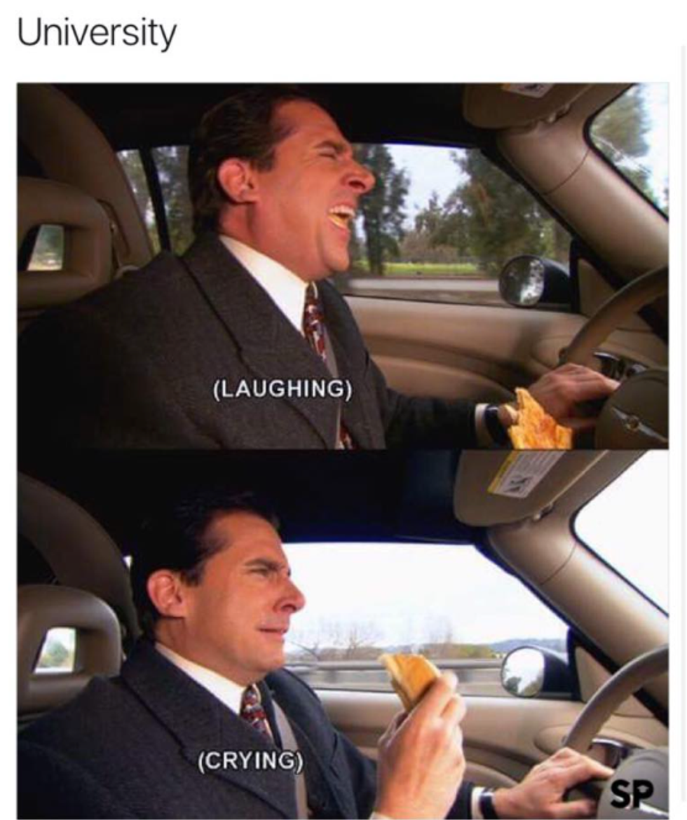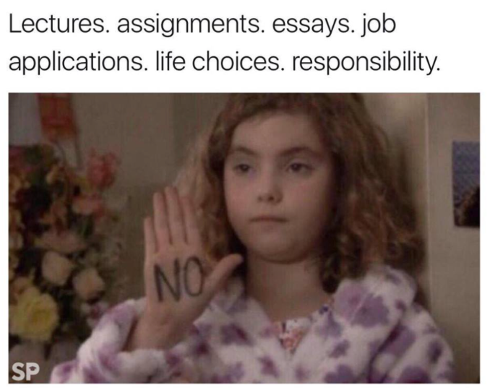 The countdown began when we returned from spring break, but now that there's only a couple more weeks, it starts to feel real, and the stress is in full gear. Deadlines are approaching, finals are drawing nearer by the day, and your motivation is hanging by a thread. If you need a study break, (or you want to continue procrastinating studying for five more minutes), have a laugh at these relatable memes.