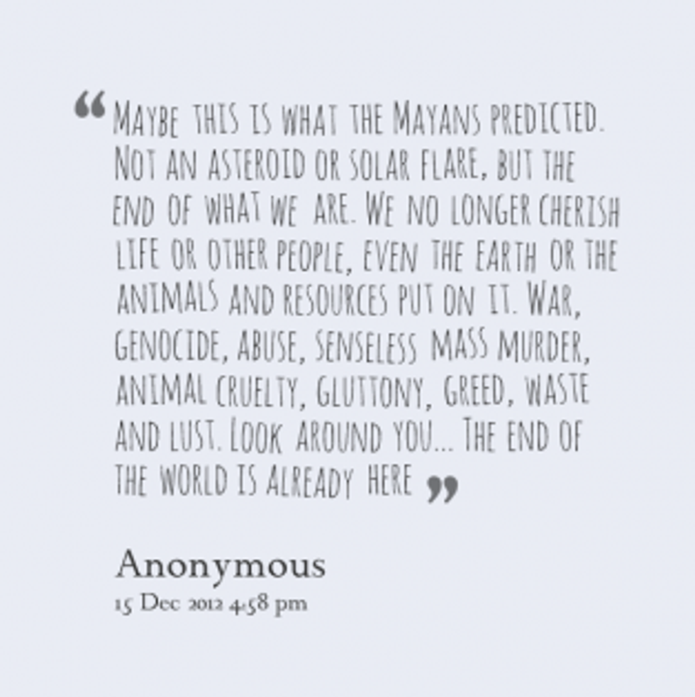 From all of the recent terror attacks, school shootings, police vs. citizen beatings, etc., the list goes on, we're overlooking a massively important point. What I've come to realize is that we are the reason the world is going to end, not because some old Mayan calendar tells us so, or because a comet is going to project itself smack dab into the center of planet earth; we are the issue. The hate crimes, the mass bombings, the horrible drunk driving incidents....when are we going to wake up and take matters into our own hands with the blame resting on human kind's shoulders? The people who commit these crimes are the end of the world, they're dooming us all, bringing us closer and closer each day to erasing the human race.