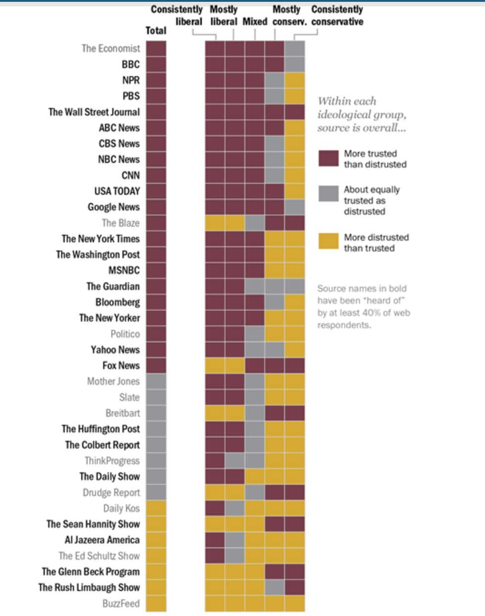 This graph can help you figure out where to get your news based on which are the most sources are the most trusted and if you want your news through a more conservative or more liberal point of view.