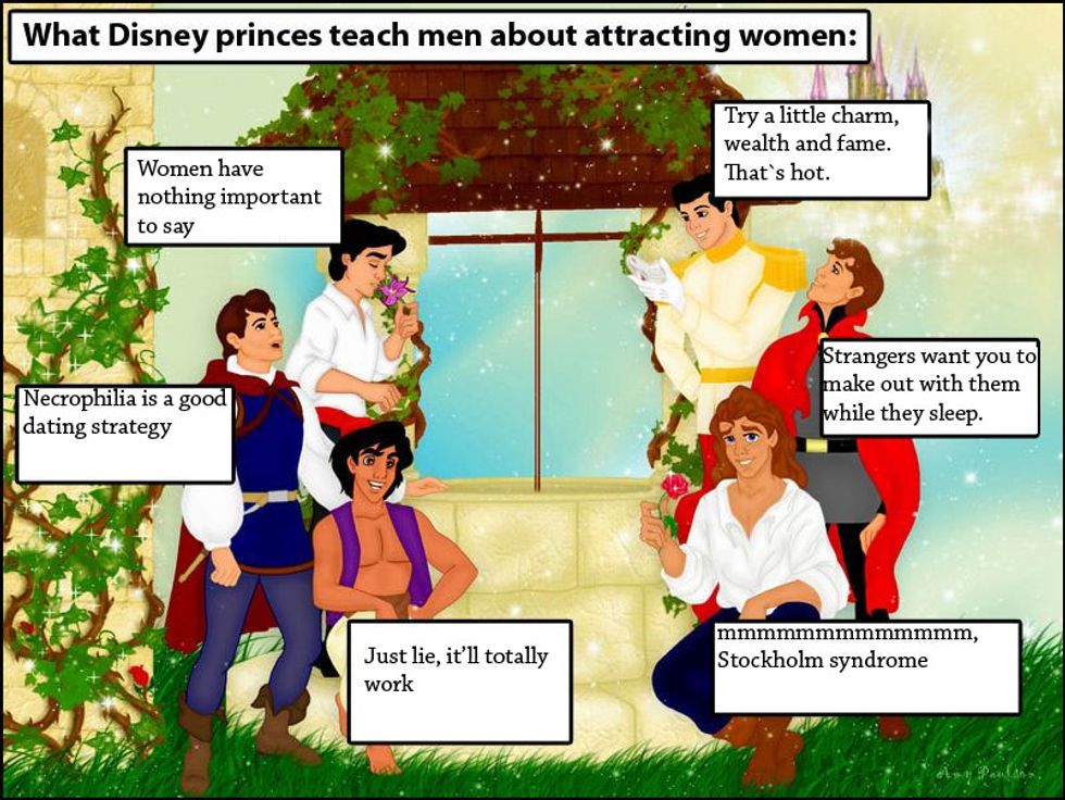 Males in Disney movies are also viewed stereotypically: they are strong, empowered, the protectors, the providers, self-reliant, tough, aggressive, courageous, humorous, and heroic.For example, in "Aladdin," Aladdin is fearless and survives using his wits, agility and street smarts. Throughout the movie, he fights “bad guys” and defeats a gigantic snake. Aladdin also shows his masculinity by wearing a very revealing vest. In "Snow White and the Seven Dwarfs," the prince rides a horse and brings Snow White back to life with a kiss.