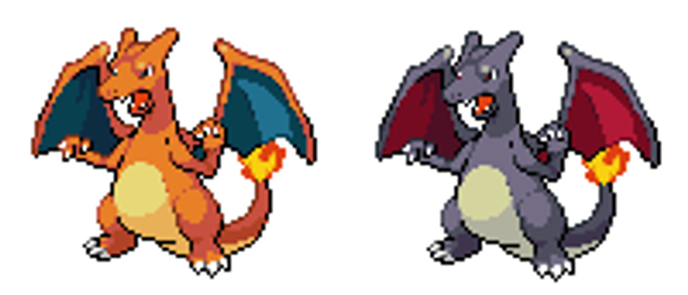 As the player progresses through the game, they encounter something odd: a Gyarados with a strange red color! In this way, the game introduces “shiny” Pokémon – rare cases of a Pokémon being a different color than usual. The rarity of these Pokémon combined with their interesting colorations made them quite desirable for players. An example, Charizard, is seen below. The one on the left is its normal color, while the one on the right is “shiny.”