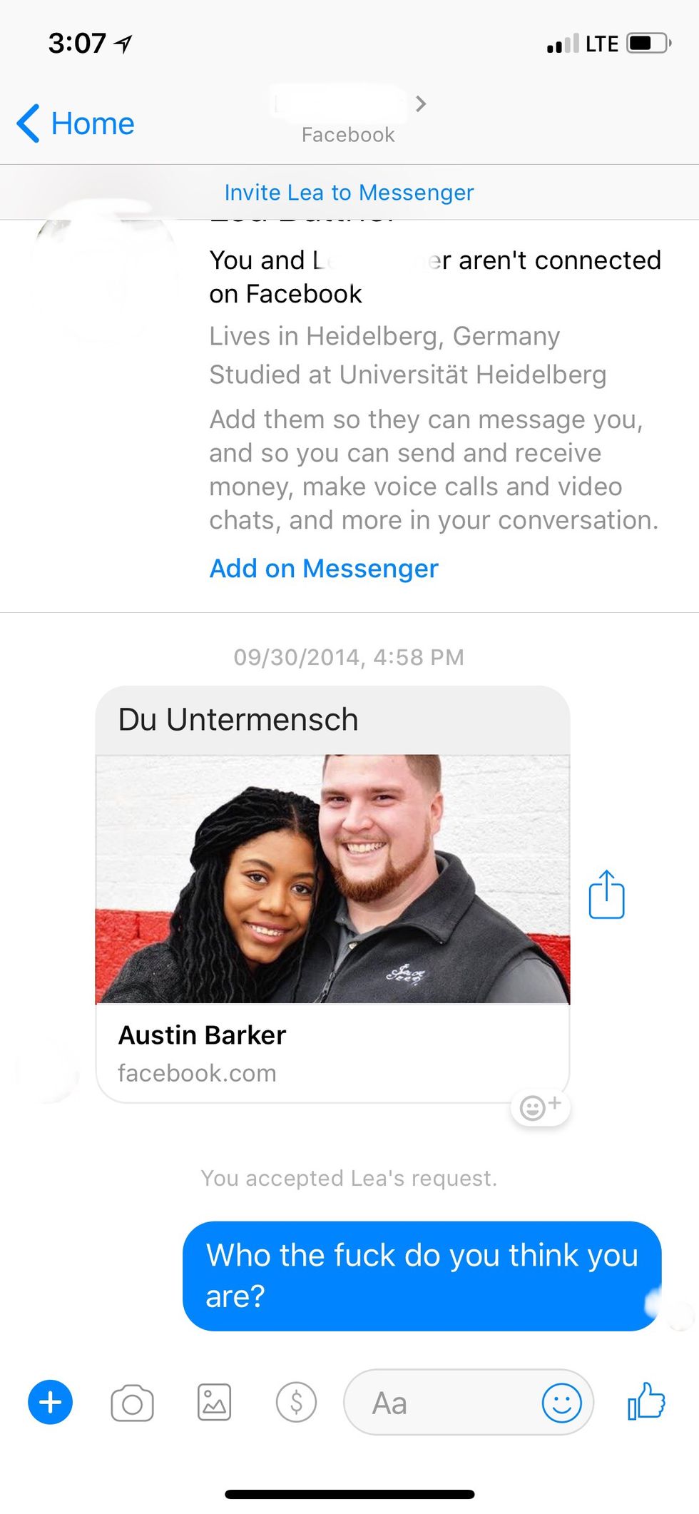My boyfriend recently got a Facebook message, attached to it was a picture of us and the message simply said " Du Untermensch." A quick google search left me in awe.