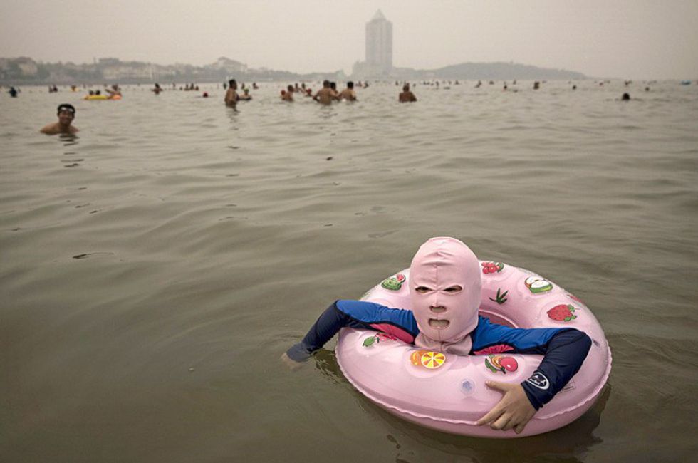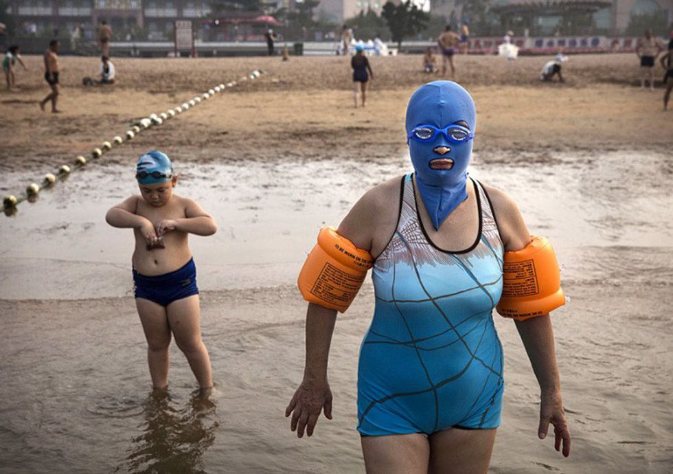 In his gallery "The face-kini: China's craziest summer beach fashion trend" for "The Telegraph," Kevin Frayer photgraphed women and children of all ages enjoying their time at the beach while wearing the mask: