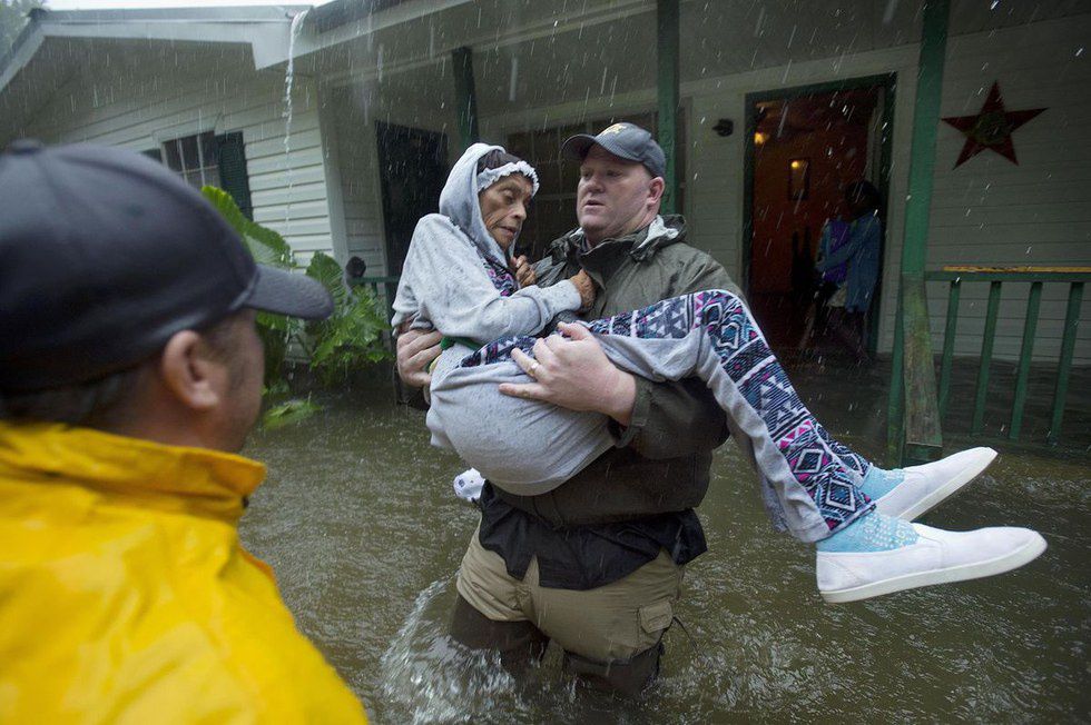 Elderly citizen being helped out of her home by volunteers in Louisiana. .