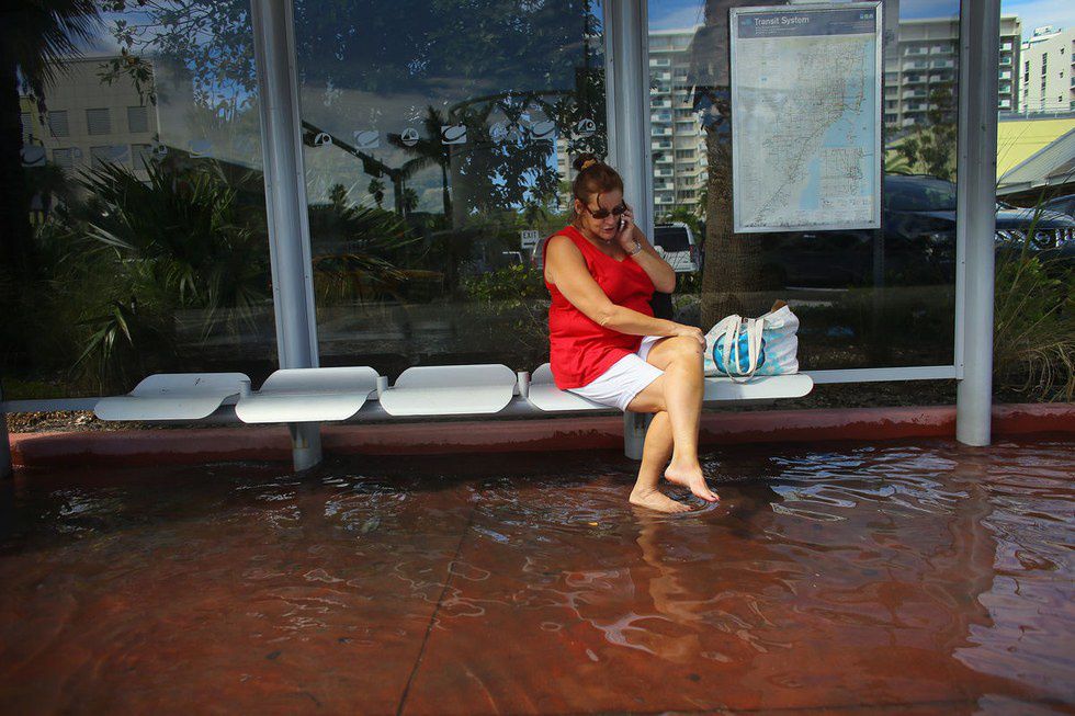 Woman waiting for bus as street floods due to "sunny day flooding" in Miami Beach, Florida. .
