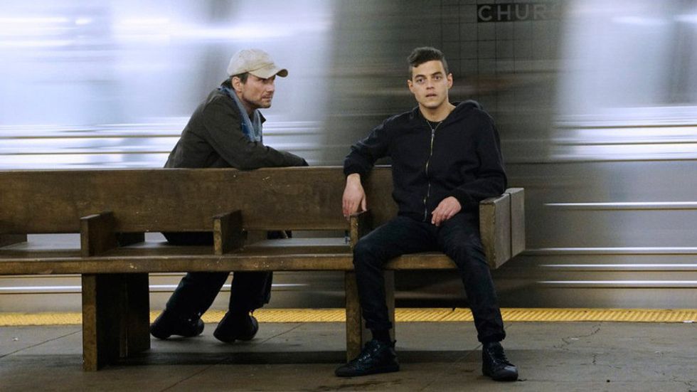 Rami Malek- the pharaoh from all those Night[s] at the Museum, The Pacific, The Master- sucks us in to this world as Elliot. He projects a dejected atmosphere to his character, isolated from everyone else because of himself, yet draws us in to want more. While speaking to the Grantland Podcast's Andy Greenwald, Malek discussed how Elliot's design was up to him, as he wanted his attire of dark hoodies and boots to resemble "an urban combat uniform." In order to achieve Elliot's sense of anxiousness, Malek even practiced avoiding people on the street, dipping out of making physical contact, method acting that spread into his real life. The show's director of photography, Tod Campbell, told Vulture he worked the show's tone and style around Malek's big eyes- which make him look like an overexcited Pete Davidson - feeling "you can really connect...and get a sense that we are present with him". Watching Malek participate in social situations, like interviews, kneads discomfort, as it is that convincing that Elliot is playing the part of the latest spotlight actor. And not the other way around.