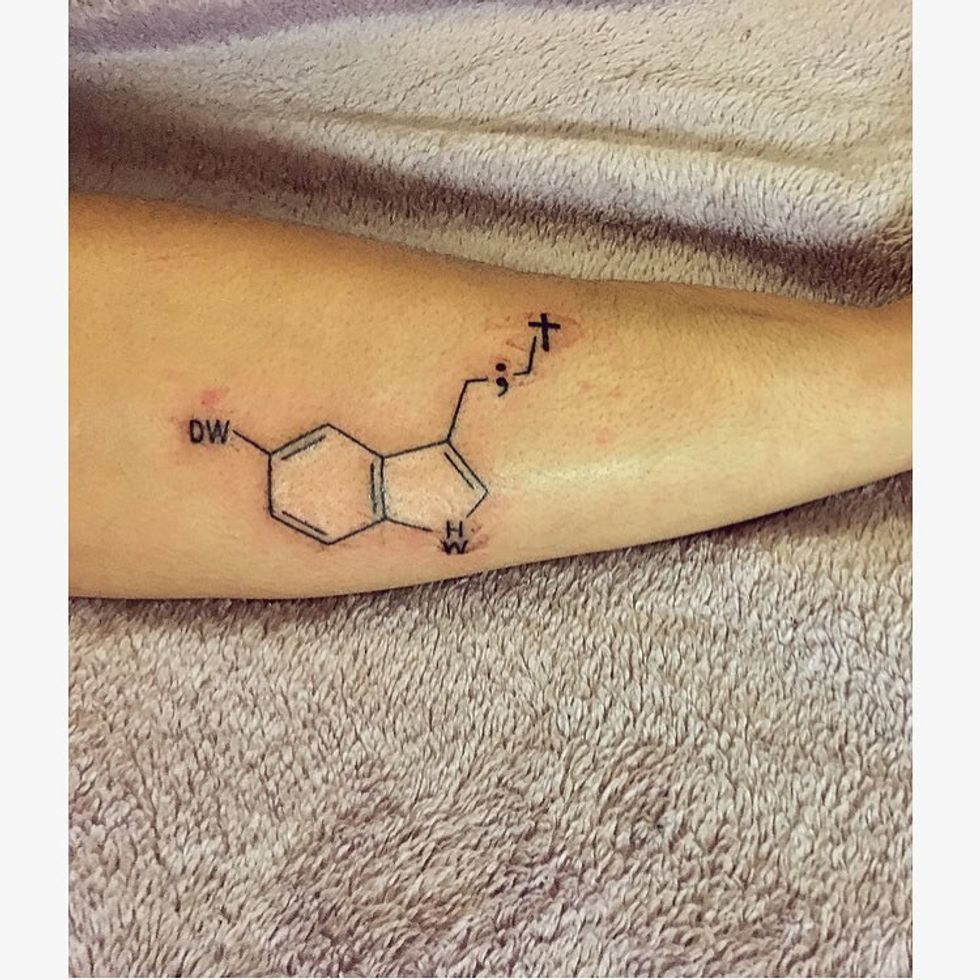 My fourth and favorite tattoo represents the chemical symbol for serotonin. Serotonin is a neurotransmitter that plays an extremely important role in controlling emotions, moods, and happiness. While it can be a positive thing, it also has the highest influence on depression, sadness, and anxiety. Although I have not shared with many people, I suffer from mental illnesses including anxiety and depression, which is my reasoning behind this article--for my voice to be heard and my demons to be let out. My mental illnesses took a large toll on me in the past months, but it has pushed me to get a tattoo to remind me that I am more than what society labels me as. Since I lack serotonin on the inside, I now have it on the outside always. As well as the serotonin symbol, I also included both of my parents initials and a cross because my parents are my biggest support system when it comes time to facing my toughest battles-- my mental illnesses and myself. The semi-colon represents the fact that my story isn't over, no matter what. God grants me the gift of life every single morning when I wake up and I know He will push me through the hardships. This tattoo is my daily reminder to create my own happiness when my body cannot produce it for me.