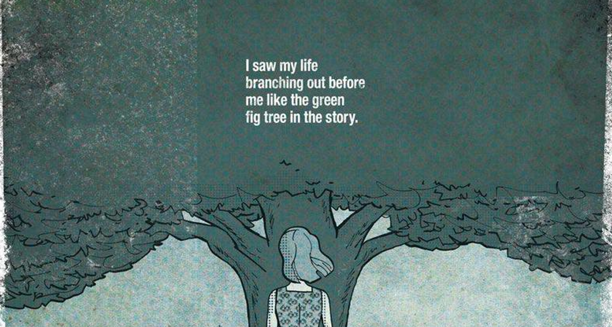 “I saw my life branching out before me like the green fig tree in the story. From the tip of every branch, like a fat purple fig, a wonderful future beckoned and winked. One fig was a husband and a happy home and children, and another fig was a famous poet and another fig was a brilliant professor, and another fig was Ee Gee, the amazing editor, and another fig was Europe and Africa and South America, and another fig was Constantin and Socrates and Attila and a pack of other lovers with queer names and offbeat professions, and another fig was an Olympic lady crew champion, and beyond and above these figs were many more figs I couldn't quite make out. I saw myself sitting in the crotch of this fig tree, starving to death, just because I couldn't make up my mind which of the figs I would choose. I wanted each and every one of them, but choosing one meant losing all the rest, and, as I sat there, unable to decide, the figs began to wrinkle and go black, and, one by one, they plopped to the ground at my feet.”