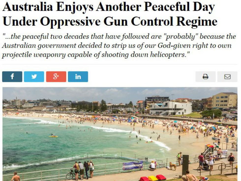 This is probably one of the reasons that the United States, with its love for guns, has such a huge problem with gun violence compared to other countries. While it seems—despite polling difficulties—that gun ownership in the United States has been declining over the past few decades, we still have plenty of guns to go around. There are somewhere around 300 million privately owned guns in the United States, and the U.S. has the highest gun ownership rate in the world. Countries that ban handguns tend to be much safer and have gun problems that are absurdly smaller than ours. The American firearm homicide rate per 100,000 people is about six times higher than Canada's and 21 times higher than Australia's, which is one reason why Australia in particular has often been used as an example of the benefits of gun control. One example is this satirical article by The Betoota Advocate: